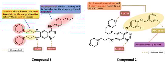 Chen et al. synthesized a series of 6,7-disubstituted 4-anilino-quinazoline derivatives with an (E)-propen-1-yl moiety as potent EGFR inhibitors. The compounds were evaluated for antiproliferative activity on four cell lines (A431, A549, NCI-H1975, and SW480). The newly synthesized compound 1 (Figure 3) showed significantly higher antiproliferative activity on all the cells than the reference drug gefitinib, and higher inhibition against EGFRwt kinase than the reference drug lapatinib (20.72 nM vs. 27.06 nM) (Table S1—Supplementary Data). Insertion of morpholine alkoxy groups in positions 6 and 7 led to increased antiproliferative activity, with a 7.5-fold higher activity for the compounds with three-carbon linkers compared to shorter two-carbon chains. The insertion of (E)-propen-1-yl group in the para-position of the aniline moiety led to a different binding mode of compound 1 in the active site of EGFR and the formation of a supplementary H-bond with Thr854 [104].