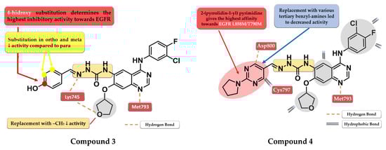 A novel series of quinazoline derivatives has been synthesized by Tu et al. by inserting an arylidene-semicarbazone moiety in the C-6 position of the lead compound afatinib. Remarkable results have been obtained with the 4-hydroxy substitution of the phenyl ring, the most active compound 3 (Figure 4) showing higher antiproliferative activity (HepG2—0.07 nM, MCF—0.91 nM, and PC-3—0.91 nM) than the reference drug afatinib (HepG2—1.40 nM, MCF—2.63 nM, and PC-3—2.62 nM) on three out of four cell lines in in vitro studies (Table S1). The replacement of the 4-hydroxy group with hydrophobic substituents (-F, -Cl, and -Br) or the further ortho- and meta-substitution with hydrophobic or hydrophilic (-OH and -OCH3) groups on the 4-hydroxy-phenyl moiety led to decreased activity [106]. The low potency of compound 3 toward the mutant form EGFRL858R/T790M (IC50 > 1000 nM) and its low stability led to further structural optimization focusing on the phenolic moiety. The best results were achieved by the replacement of the benzene ring with nitrogen-containing heterocycles to generate novel H-bonds with the target. Compound 4 (Figure 4) bearing a 2-(pyrrolidin-1-bestpyrimidine side chain had the most promising results, with a similar antiproliferative and EGFR L858R/T790M inhibitory activity (IC50 = 8.4 nM) to that of the reference drug afatinib (IC50 = 3.8 nM) (Table S1) [107].