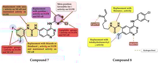 Hamad et al. synthesized a series of novel dual inhibitors of EGFR kinase and nuclear factor kappa B (NF-κB) activities. The insertion of various hydrophilic substituents (sulfonamides, hydroxy groups) on the 4-anilino moiety or the total replacement with amino-pyridine led to decreased inhibitory activity for both EGFR and NF-κB. The substitution with small and lipophilic (-Br, -Cl, and -methyl) groups particularly in the meta position increased the inhibitory activity. The thiourea linker is mandatory for the inhibitory activity toward NF-κB. The replacement with a urea linker led to the decreased inhibitory activity of NF-κB but conserved affinity for EGFR kinase. The substitution of the lateral benzene ring at the C-6 position of the quinazoline core with small and lipophilic groups increased inhibition potency for both targets while the insertion of hydrophilic groups led to decreased activity. Total replacement of the lateral benzene ring with substituted thiadiazole or thiazole rings led to increased affinity toward NF-κB and less affinity for EGFR (>100 nM). In vitro data of the antiproliferative activity of prototype compounds “6c” and “6h” (structures not provided) on A549 cells (1.6 µM and 1.0 µM) suggested that the dual inhibitory mechanism might provide an advantage in EGFR-dependent cell lines. SAR studies led to the synthesis of compound 7 (Figure 6) with remarkable inhibitory activity toward NF-κB (IC50 = 0.3 µM) and EGFR kinase in a nanomolar range (IC50 = 60.1 nM). Compound 7 displayed elevated antiproliferative activity on MDA-MB-231 cells (0.9 µM), higher than that of the reference drug gefitinib (14.2 µM) (Table S1), and inhibited the in vivo development of a tumor in a xenograft model with fewer side effects [111].
