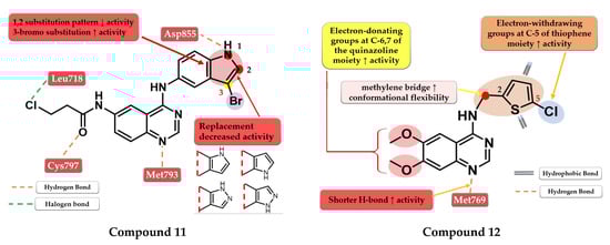 Zou et al. synthesized a series of novel quinazoline derivatives by inserting a thiophene-2-ylmethanamine at the C-4 position of the quinazoline core to increase the conformational flexibility. The synthesized molecules displayed good antiproliferative activity on A431 cells, the most active compound 12 (Figure 8) having comparable results (IC50 = 3.4 µM) with the reference drug erlotinib (IC50 = 3 µM) (Table S1). The insertion of electron-donating groups at the 6 and 7 positions of the quinazoline core increased the activity of the compounds. The 6,7-dimethoxy substitution was more favorable for the inhibition of EGFR due to the slight deviation of the quinazoline core in the active site of EGFR generated by bulkier groups (2-methoxy-ethyl-oxy) leading to shorter H-bonds with Met769 and the N-1 of the quinazoline core. The further substitution of the C-5 position of the thiophene moiety with small lipophilic substituents (-Cl and -Br) led to a significant increase in the antiproliferative activity [117].