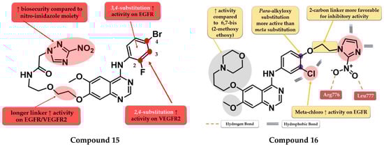 Cheng et al. synthesized a series of lapatinib analogs by replacing the benzyloxy moiety with nitro-imidazole residues to obtain compounds with increased activity in hypoxic conditions. Compound 16 (Figure 10) displayed higher antiproliferative activity on the tested cells in both normoxia (1.59 µM and 2.46 µM) and hypoxia (1.09 µM and 1.35 µM) conditions compared to the reference drug lapatinib (11.3 µM and 13.26 µM; 6.81 and 8.85 µM) (Table S1). The meta-chlorine substitution on the aniline moiety was beneficial for the activity due to the hydrophobic interactions. The insertion of 2-nitro-imidazole-1H-alkyloxyl in the para position of the aniline moiety led to significantly higher activity on EGFR compared to meta substitution, generating a binding mode in the active site of EGFR similar to lapatinib. Compounds bearing a three-carbon alkyloxy linker were less potent than the ones bearing a two-carbon bridge due to an unfavorable binding mode within the active site of EGFR leading to a more “out” binding position compared to lapatinib [121].
