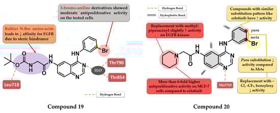 Zheng et al. evaluated the addition of various N-Boc amino acid moieties in position 6 of the 4-anilino-quinazoline scaffold on antiproliferative activity. The 3-bromo-aniline compound 19 (Figure 12) bearing an N-Boc glycine residue in position 6 showed moderate antiproliferative activity on HepG2 cells (IC50 = 8.3 µM) and a potent inhibitory activity against EGFR (IC50 = 3.2 nM) with a 2000-fold higher selectivity over various kinases related to liver cancer (Table S1). Molecular docking studies of compound 19 revealed a novel H-bond interaction between the nitrogen atom of the side chain in position 6 and Leu718. The steric hindrance of this bond by replacing N-Boc glycine with various bulkier N-Boc amino acids led to decreased activity [125].