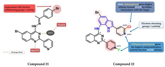 Ahmed et al. synthesized a novel series of 6-bromo-2-(pyridin-3-yl)-4-substituted quinazolines as potential dual EGFR-HER2 inhibitors. The 4-bromo-phenylethylidene-hydrazinyl compound 21 (Figure 13) displayed the highest inhibitory activity toward EGFRwt (46.1 nM) comparable with that of lapatinib (53.1 nM). The para-substitution of the phenyl moiety with various EWGs (-Cl, -Br, -F, and -SO2CH3) led to higher inhibitory activity compared to electron-donating groups (-CH3 and -OCH3). In vitro testing revealed an increased cytotoxic activity toward MDA-MB-231 cells compared to the reference drug lapatinib (Table S1) [127].