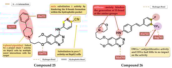 A series of 4-anilino-quinazoline derivatives were synthesized by Chang et al. by modifying the substituent in the C-7 position of the quinazoline core. Highly rigid substituents (methylbenzyl-amino, hydroxyethyl-benzylamino, and 2-hydroxyethyl-piperidinyl) and amino alcohol groups (4-hydroxypiperidinyl and 4-hydroxyethylpiperidinyl) linked in the C-7 position of the quinazoline core led to weak antiproliferative activity. Remarkable results were obtained with the 4-piperidinyl-piperidinyl, 4-phenylpiperidinyl, 4-ethyl-piperazinyl, and pyrrolyl residues. The most active compound 25 (Figure 15) has a broad anticancer effect, higher antiproliferative activity, and inhibitory activity toward EGFR similar to the reference drug gefitinib (3.62 nM) (Table S1). The binding mode of compound 25 into the kinase domain of EGFR showed multiple interactions of the C-7 side chain, including hydrophobic and π–π interactions with Phe771 and Tyr777 residues [132].