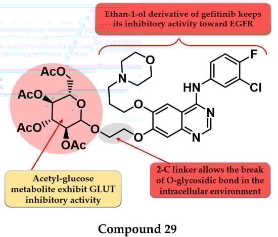 To enhance the radio-sensitizing effect while maintaining the inhibitory activity toward EGFR, Yamahana et al. synthesized a novel series of acetyl glucose-modified gefitinib derivatives. The compounds displayed antiproliferative activity (IC50 = 34.3–39.4 nM) similar to gefitinib (IC50 = 31.2 nM) and a significantly higher radio-sensitizing effect. A longer alkyloxy linker (2–4 carbons) between the quinazoline core and the acetyl glucose moiety allows the break of the O-glycosidic bond and the generation of an alkyl-7-ol derivative of gefitinib metabolite (which keeps the inhibitory activity toward EGFR). The most active compound 29 (Figure 17) displayed increased EGFR inhibitory activity and cytotoxicity (Table S1) [136].