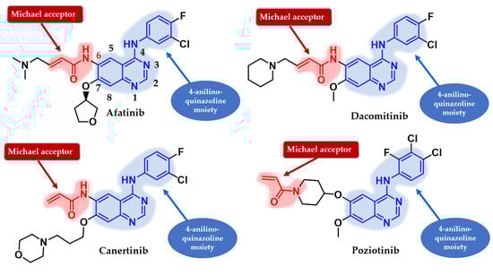 - Liu, Z.; Wang, L.; Feng, M.; Yi, Y.; Zhang, W.; Liu, W.; Li, L.; Liu, Z.; Li, Y.; Ma, X. New Acrylamide-Substituted Quinazoline Derivatives with Enhanced Potency for the Treatment of EGFR T790M-Mutant Non-Small-Cell Lung Cancers. Bioorg. Chem. 2018, 77, 593–599. [Google Scholar] [CrossRef] [PubMed]