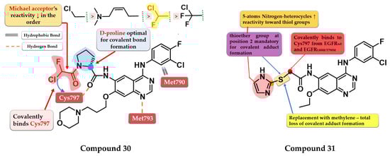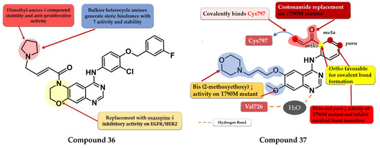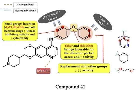 The 4-anilino-quinazoline moiety has emerged as a privileged scaffold for developing novel first-generation EGFR TKIs due to a series of structural properties [27,97]. SAR studies of the already approved quinazoline-based EGFR TKI and novel synthesized compounds revealed that the formation of H-bonds between the N-1 quinazoline ring and a series of methionine residues (Met793 and Met769) and between N-3 and threonine residues through water bridges (Thr766 and Thr830) leads to a tighter binding conformation of the inhibitor to the active site of the kinase and also to increased potency [28,96,98].