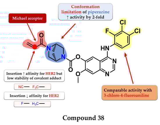 The low electron density of the morpholine core in the structure of gefitinib (Figure 1) led Ju et al. to synthesize a novel series of quinazoline derivatives with a macrocyclic polyamine side chain at the C-6 position of the quinazoline core. The replacement of the morpholine moiety with 1,4,7,10-tetraazacyclododecane (cyclen) or 1,4,7-triazonane (tacn) led to a two-fold increase in the antiproliferative activity on A431 cells compared to the reference drug gefitinib, while the cyclen derivatives were found the most potent on A549 cells. Further structural optimizations led to the synthesis of compound 27 (Figure 16) by replacing the halogenated aniline moiety at C-4 with 3-chloro-4-((3-fluorobenzyl) oxy)-aniline. Compound 27 was found to effectively deplete intracellular ATP at 8 μM. It displayed a significant increase in the antiproliferative activity on both cell lines (A431 0.95 µM and A549 3.4 µM) compared to gefitinib (2.47 µM and 11.08 µM) and lapatinib (2.66 µM and 3.64 µM). Compound 27 is a potent inhibitor of both EGFR (1.4 nM) and HER2 (2.1 nM) with a nine-fold higher affinity for EGFRT790M (16.5 nM) compared to gefitinib (148.7 nM) (Table S1) [134].
