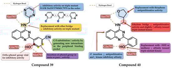 Structure–activity relationship and molecular docking of compound 25 in the human EGFR kinase domain (PDB ID 1M17) [124], as reported by Chang et al. [132]; structure–activity relationship and molecular docking of compound 26 in the human EGFR kinase domain (PDB ID 1XKK) [101], as reported by Wang et al. [133].