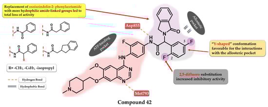 The molecular architecture of the ATP-binding pocket can be subdivided into specific regions according to the interactions between ATP and the key amino acids: hinge regions (adenine binding pocket) and solvent-accessible regions (sugar and phosphate binding region). Of particular interest for drug discovery are a series of hydrophobic pockets (I and II) and the back pocket (also called allosteric pocket) in the back of the gatekeeper residue that is in the proximity of the first mentioned regions [91,92,93]. Most of the approved quinazoline derivatives (gefitinib and erlotinib) follow a type I inhibition mechanism, binding to the active conformation of the receptor in a competitive manner with both ATP and Asp residue of the DFG-motif (Asp855-Phe656-Gly857) pointing inward to the binding site (αC-in conformation) [94], that narrows the efficiency spectrum of the EGFR mutants inhibited to activator mutations of the kinase domain [95]. Selected inhibitors (such as lapatinib) follow a type ½I inhibitory mechanism, binding mainly to the active conformation (αC-out and DFG-in) with access to the allosteric pocket and improved (but not clinically relevant) affinity for EGFR mutant forms stabilized in the inactive conformation [92,95].