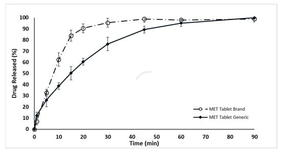 The higher values observed for the mean resistance force, tablet disintegration, and friability in the generic MET product compared to the branded MET product might be due to the incorporation of starch in the tablet formulation of the generic MET product, as reported by some research studies [44,45]. This ingredient has been known to impact the properties of tablets and may play a role in the differences observed between the two products [40,46,47]. Starch is a hygroscopic material that may increase a tablet’s absorption of moisture, leading to a more compact tablet with a higher mean resistance force [46,47]. Additionally, the hydrophilic nature of starch can affect the disintegration period of a tablet [44,45]. Starch molecules absorb moisture and form a gel-like substance that binds particles together, which might prolong the release rate of active ingredients [44,45]. Similar effect of starch on the hydralazine HCl was reported [25].