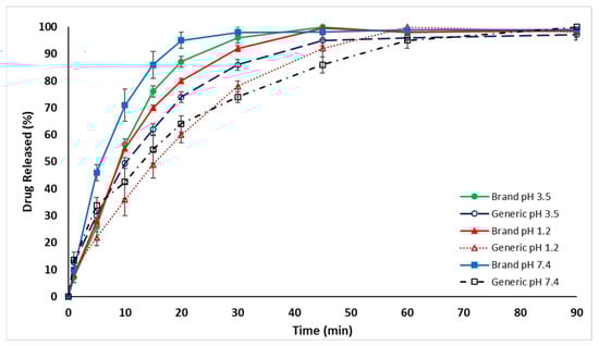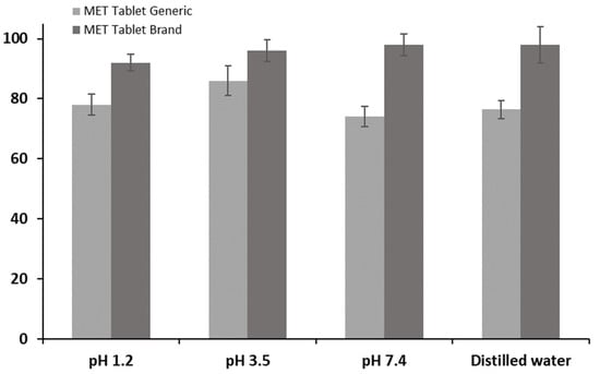 The drug release rate for the generic MET product (MET Tablet Generic) was found to be lower than that of the branded MET product in distilled water (DW), as illustrated in Figure 1. The results showed that the percentage of drug release from the generic MET product was below 80% in the first 30 min, which did not meet the standards and specifications set by the United States Pharmacopeia (USP) [40,41,42], whereas 95% of the branded MET product (MET Tablet Brand) was released in DW in the first 30 min. Figure 2 and Figure 3 demonstrate that the drug release rate of the generic MET product was significantly lower in all pH conditions (1.2, 3.5, and 7.4) and particularly over the first 30 min compared to the branded MET product (p < 0.05). It is evident that the release rate of the generic MET product was dependent on the pH media, as compared to the branded MET product, which was pH-independent [43].
