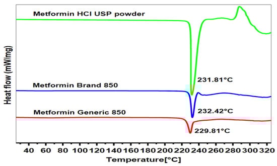 Figure 4 presents the results of the thermal profiles for the pure MET powder, the MET branded product, and the MET generic product, as determined by DSC. The thermal profile of the branded MET product displayed an endothermic peak at 232.42 °C, with a range from 224.22 °C to 239.42 °C, which is very similar to the endothermic peak value for the pure MET powder. The endothermic peak of pure MET powder was 231.81 °C, with a range from 217.03 °C to 248.79 °C. On the other hand, the generic MET product had the shortest endothermic peak at 229.81 °C, with the sample starting to melt at 204.89 °C and ending at 246.86 °C. Furthermore, the area under the curve was the lowest for the generic MET product; the heat absorbed by the samples was 165.65 J/g for the generic MET product, 226.21 J/g for the branded MET product, and 324.77 J/g for pure MET powder (p < 0.05).