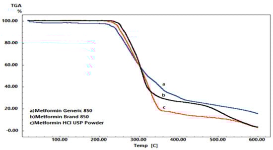 The TGA profiles for the three samples (pure MET powder, branded MET product, and generic MET product) showed significant differences in terms of weight loss (p < 0.05). As shown in Figure 5, the weight losses for pure MET powder and the branded MET product were almost the same, with approximately 97% of the total weight loss. The weight loss was 7.937 mg for the pure MET powder and 6.114 mg for the branded MET product. However, the generic MET product showed a significantly lower amount of weight loss, with approximately 82% of the total weight lost (p < 0.05), equaling 4.936 mg. The onset temperature of weight loss also varied among the samples as shown in Figure 5. These variations in weight loss and (Tonset) temperature indicate that some differences occurred in the physical properties of the generic MET product.