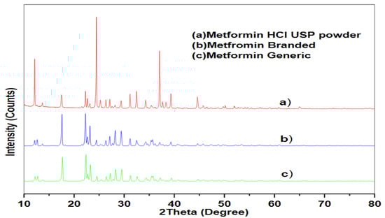 X-ray diffraction analytical spectra of MET in the form of (a) drug pure powder, (b) branded tablet and (c) generic tablet.