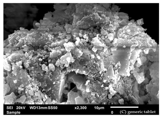 The main morphological features of pure MET powder, the branded MET product, and the generic MET product are presented in Figure 7. The particle size was the smallest for the generic MET product, followed by the branded MET product and then pure MET powder. The distance between particles in the generic MET product was the shortest in comparison to the two other samples. The SEM images of the three samples showed a coarse surface for the particles of the generic MET product, with some cracks and stretches, while a smooth surface was observed for the branded MET product and pure MET powder.