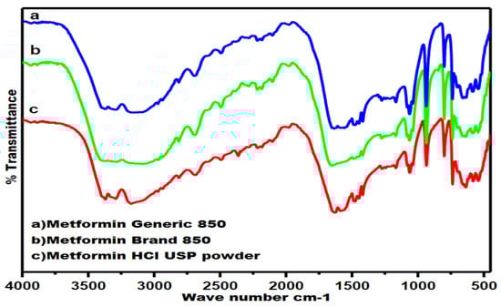 Fourier-transform infrared analytical spectra of MET in the form of (a) generic tablet, (b) branded tablet and (c) drug pure powder.