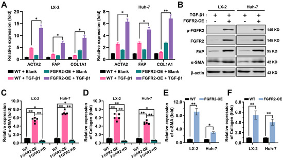 FGFR2 drives the process of liver fibrosis. (A) The expression of liver fibrosis markers (ACTA2, fibroblast activation protein alpha (FAP), alpha-1 type I collagen (COL1A1)) was measured by qPCR. The samples were divided into four groups according to whether cells were induced with or without TGF-β and whether cells were overexpressed by FGFR2. (B) The expression of markers in wild-type and FGFR2-OE cell lines under TGF-β induction was analyzed by Western blot analysis. (C) The expression levels of α-SMA and (D) collagen secretion in LX-2 and Huh-7 were evaluated, when FGFR2 was overexpressed or knocked down upon equal TGF-β induction. (E) Cells were collected after 48 h of co-culture, and the expression of α-SMA and (F) type I collagen in the lower layer cells was determined by ELISA. The results are marked as significant “*” when p < 0.05, “**” when p < 0.01, and not significant (ns) if p ≥ 0.05.