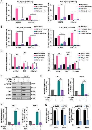 The study then aimed to evaluate the inhibitory effect of CYN on the fibrosis-promoting effect of FGFR2. The presence of CYN was found to reduce the sensitivity of wild-type and FGFR2-OE LX-2 cells and Huh-7 cells to TGF-β, leading to a reduction in the expression of fibrosis-related markers (Figure 4A). CYN was also observed to block the overactivation of FGFR2 induced by basic fibroblast growth factor (bFGF), an FGFR2 ligand that transmits signals between cells (Figure 4B). Furthermore, results from the qPCR, Western blot, and ELISA collectively demonstrated that the presence of CYN reversed the increased expression of fibrosis markers caused by TGF-β (Figure 4C,D) and reduced the levels of α-SMA expression (Figure 4E). and collagen secretion (Figure 4F). The co-culture model also showed that CYN weakened the activation of lower-layer cells in response to upper-layer activated cells (Figure 4G). In conclusion, the presence of CYN reduces the sensitivity of LX-2 cells and Huh-7 cells to TGF-β, and this inhibitory effect is also suitable for FGFR2 hyperactivation cases.