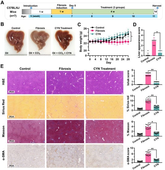 2.5. CYN Attenuates the Progression of Liver Fibrosis In Vivo