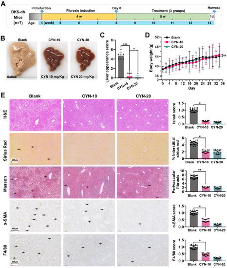 The high-fat diet NASH animal model was also utilized to evaluate the therapeutic effect of CYN (Figure 6A, Supplementary Figure S2D). Consistent with the above findings, the mice in the CYN-treated group demonstrated more normal liver morphologies (Figure 6B,C). Meanwhile, CYN treatment did not influence the bodyweights (Figure 6D), food intakes (Supplementary Figure S2E), or blood glucose contents (Supplementary Figure S2F) of the mice. The staining of liver sections indicated that the CYN-treated group showed less steatosis, a lower percentage of sirius red staining in interstitial liver tissue, reduced perivascular collagen expression, and decreased α-SMA expression compared with the blank group. Furthermore, EGF module-containing mucin-like receptor (F4/80) staining revealed that CYN treatment resulted in a milder intrahepatic inflammatory environment. In addition, it was found that the administration of CYN at a dose of 20 mg/kg resulted in improved outcomes compared to a dose of 10 mg/kg. These results suggest that CYN exhibits a protective effect on the liver in response to NASH-induced liver fibrosis. In conclusion, these findings suggest that CYN has the potential to attenuate the progression of liver fibrosis in vivo and could be a promising option for the clinical treatment of liver fibrosis (Figure 6E).