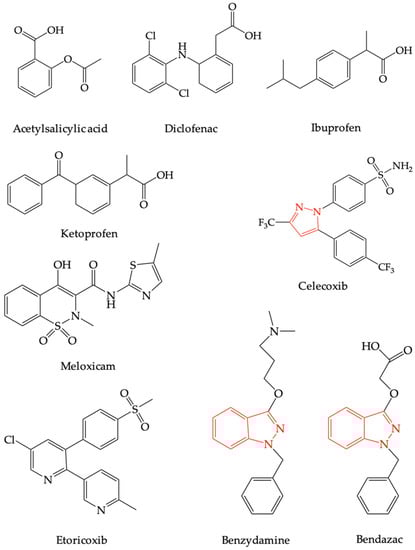 Benzydamine is a non-steroidal anti-inflammatory drug (NSAID) with completely different structure than other NSAIDs recorded in therapy, with celecoxib as the only relatively structurally related compound because it possesses a pyrazole nucleus [31]. Thus, the only structurally related compound used in therapy for the same therapeutic indications (anti-inflammatory) and which is strictly local, in the form of eye drops, is bendazac (see Figure 1) [32].
