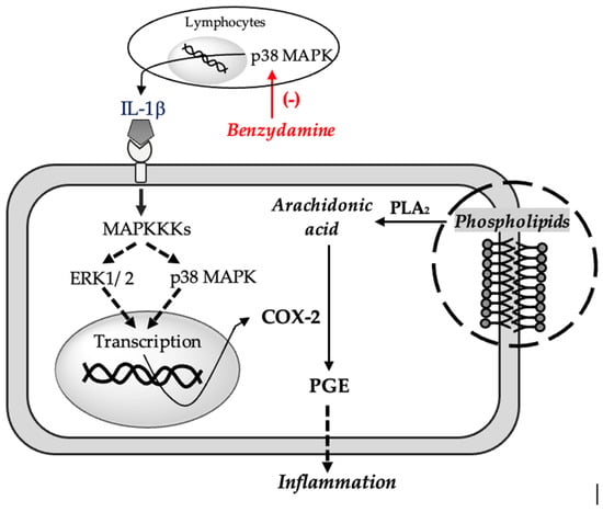 In-vitro studies using human and mouse mononuclear cells have shown that benzydamine prevents the release of pro-inflammatory cytokines (especially TNFα and IL-1β) without significantly influencing the synthesis of inflammatory cytokines (IL-6, IL-8) [34], anti-inflammatory (IL-10) and interleukin-1 receptor antagonist (IL-1RA) following exposure to activator of monocytes and macrophages (e.g., lipopolysaccharide) [33]. This decrease in the synthesis of pro-inflammatory cytokines, however, leads to a decrease in COX-2 activity, taking into account that the enzyme is activated by IL-1 extracellular signal-regulated kinase (ERK1/2) and mitogen-activated protein kinase (p38 MAPK) cascades [35]. A decrease in COX-2 activity should contribute to a decrease in the synthesis of PGE2 mediators that in turn increase COX-2 expression by phosphorylation of p38 [36] (see Figure 2). More recent studies have shown that benzydamine can inhibit monocyte migration and block the p38 MAPK pathway, a key regulator of pro-inflammatory cytokines biosynthesis [37].