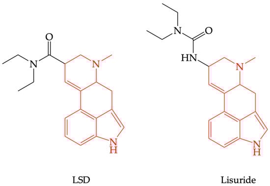 There are some question marks over the consequent effects of 5-HT2AR stimulation, since, in therapy, there are registered 5-HT2AR agonists with no psychotropic effects, such as lisuride [44], which have compounds structurally related to LSD (see Figure 4). This is possible because of differences in intracellular signal transduction consecutive to receptor stimulation, a phenomenon known as “biased agonism”. Thus, being Gq/11-protein-coupled receptor, 5-HT2AR stimulation increases phospholipase C (PLC) activity, an enzyme that hydrolyzes phosphatidyl inositol diphosphate (PIP2) into inositol triphosphate (IP3) and diacylglycerol (DAG); IP3 mobilizes calcium from the endoplasmic reticulum, increasing cytosolic calcium concentration, which could explain the central excitatory effects [45]. Judgment disorders that occur in schizophrenia or after the use of psychotropic substances surface as a result of changes in sensorimotor integration and decision-making [46].