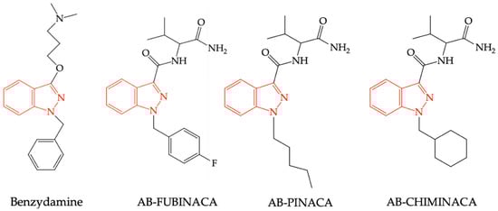 Another synthetic cannabinoid, an indazole derivative, similar to benzydamine, was synthesized by the Pfizer company in 2009 as a potential analgesic. AB-FUBINACA has been shown to have an increased affinity for CB1R, acting as an agonist of these receptors, similarly to other structurally related compounds such as AB-PINACA and AB–CHIMINACA, respectively (see Figure 5). Due to adverse reactions of these compounds observed in rodent studies (catalepsy, hypothermia, dose-dependent and inconsistent effect on locomotor activity, agitation, anxiety), as well as those reported in humans (agitation, anxiety, hallucinations), these substances have never been recorded in therapy. However, the previously mentioned compounds are found as “impurities” in various trafficked preparations, especially on the black market, or used as street drugs [65].