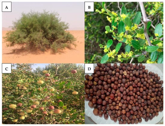 The Ziziphus lotus L. (Z. lotus) is a spiny fruit shrub, and a member of the family Rhamnaceae. It grows in tufts that are a few meters in diameter and up to two meters high, and is commonly called “Sedra” in North Africa (Figure 1A) [29]. Flowers of Z. lotus are small, axillary, bisexual, pentameric, and grouped in a cymose inflorescence, with sepals open in the star, small petals, and upper ovary, blooming in June–July (Figure 1B) [30]. The fruits of Z. lotus are drupes with welded stones, having the shape and size of a beautiful olive, first green, then young, and finally dark red at maturity from September to October (Figure 1C,D) [14]. The fructification begins in the fourth year in full yield around the age of fifteen; it is very productive when it receives copious watering during the summer [14]. The plant has oblong, whole-margined, short-petiolate, glabrous, alternating, deciduous leaves, and each leaf bears at its base two stipules transformed into an uneven and vulnerable thorn (Figure 1B) [14].