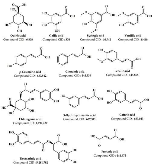Numerous earlier investigations focused on the phytochemical composition of extracts from various Z. lotus parts have been published [17,19,20,21,24,25,26,27,101,102,103,104,105,106,107]. Analysis of the data grouped in Table 2 allowed us to identify more than 181 phytochemical compounds present in the Z. lotus extracts from different countries (Tunisia, Morocco, and Algeria). These phytochemicals encompass a significant number of fatty acids and four significant families of secondary metabolites including phenolic acids, terpenoids, flavonoids, and alkaloids (Table 2). The chemical structures of the main phytoconstituents present in Z. lotus extracts are presented in the figures according to their chemical classes, phenolic acids (Figure 2), flavonoids (Figure 3), terpenes (Figure 4), fatty acids (Figure 5), and alkaloids (Figure 6). In fact, in the methanol extract of the leaves, seeds, and fruits of Z. lotus from Tunisia, 28 phenolic compounds were found by Yassine et al. (2020) using liquid chromatography-electrospray ionization-tandem mass spectrometry (LC-ESI–MS) analysis [19]. The authors of this study indicate that quinic acid, ferulic acid, epicatechin, rutin, quercitrin, naringin, and cinnamic acid are major phenolic compounds in this extract. In addition, 10 phenolic components including fumaric acid, catechin, tyrosol, gallic acid, syringic acid, p-coumaric acid, vanillin, ferulic acid, caffeic acid, and cinnamic acid were found in the methanol extract from Tunisian Z. lotus leaves using the high-performance liquid chromatography (HPLC) method [17]. Previous phytochemical studies have reported the identification of 15 different phytochemical compounds present in the methanolic extract of the fruits and leaves of Moroccan Z. lotus, namely galloyl shikimic acid, (-)-catechin 3-O-gallate, malic acid, quercetin, rhamnosyl-rhamnosylglucoside, quercetin di-glucoside, eriodictyol, macrocarpon C, amorfrutin A, isovitexin-2″-O-rhamnoside, hyperin, astragalin, 7,8-dihydrobiopterin, quercetin-3-galactoside, and kaempferol-3-diglucoside. According to other investigations, the aqueous extract of Moroccan Z. lotus fruits and leaves contains 22 distinct phenolic compounds including gallic acid, pyrogallol, chlorogenic acid, catechin, rutin, p-hydroxybenzoic acid, caffeic acid, vanillic acid, epicatechin, syringic acid, p-coumaric acid, 3-hydroxycinnamic acid, ferulic acid, sinapic acid, salicylic acid, rosmarinic acid, resveratrol, quercetin, naringin, catechol, hydroxytyrosol, and naringenin [20,21]. Other investigations have indicated that the aqueous extract of the branches and leaves of Algerian Z. lotus revealed the presence of 18 phenolic compounds, which were defined as quercetin-3-O-(2,6-di-O-rhamnosylglucoside)-7-O-rhamnoside, quercetin-3-O-(2,6-di-O-rhamnosylglucoside), myricetin-3-O-rutinoside, quercetin-3-O-(2,6-di-orhamnosylglucoside-7-O-glucuronide, kaempferol-3-O-(2,6-di-O-rhamnosylglucoside), phloretin-di-c-hexoside, quercetin-3-O-rutinoside, kaempferol-O-hexoside, kaempferol-3-O-(2,6-di-O-rhamnosylglucoside), oleuropein hexoside, kaempferol-3-O-rutinoside, kaempferol-3-O-(6-O-rhamnosyl-glucoside), apigenin-O-hexoside-O-deoxyhexoside, oleuropein, catechin, quercetin-O-deoxyhexoside, eriodictyol-O-deoxyhexoside, (Epi)catechin-(epi)gallocatechin, and (-)-epicatechin [26]. In addition, Ghedira et al. (1993, 1995) and Croueour et al. (2002) identified seven alkaloid compounds in the root bark extract of Z. lotus: lotusine A, lotusine D, lotusine B, lotusine C, lotusine E, lotusine F, and lotusine G [108,109,110].