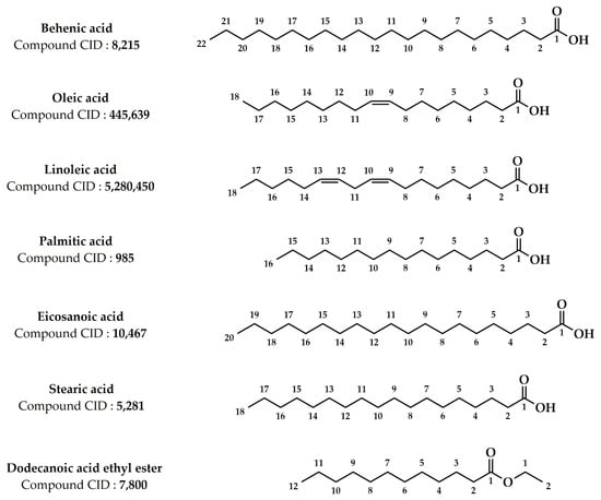 Comparatively, we observed that the chemical composition of Z. lotus extracts varied from one country to another. This variation in the chemical composition between identical Z. lotus extracts from other countries may be provoked by a variety of elements including the collection’s origin, the climate during the harvest, the harvest season, and the extraction technique [111]. Letaief et al. (2021) studied the phytoconstituents of the essential oils from the aerial part of Tunisian Z. lotus using the gas chromatography-mass spectrometry (GC–MS) [107]. The authors of this investigation reported that the essential oil of Z. lotus contains 36 volatile compounds, with the major components being hexahydrofarnesyl acetone, followed by geranylacetone, cis-hexenyl-3-benzoate, 2-pentadecanone, dodecanoic acid ethyl ester, and n-hexadecanoic acid. In addition, Rais et al. (2020) showed the existence of fatty acids such as oleic acid, palmitic acid, stearic acid, and linoleic acid in the essential oil extracted from the seeds of Moroccan Z. lotus (Figure 3) [106]. Zazouli et al. (2022) studied the chemical composition of lipophilic fractions (dichloromethane extract) of different parts of the Moroccan Z. lotus using GC–MS (Table 2) [102]. A total of 99 lipophilic compounds including fatty acids, long-chain aliphatic alcohols, pentacyclic triterpenic chemicals, sterols, monoglycerides, aromatic substances, and other minor substances were identified and measured in this recent study. In reality, it has been shown that the majority of lipophilic extracts of the pulp, leaves, and seeds are composed of fatty acids. Unsaturated fatty acids, specifically acid (9Z,12Z)-9,12-octadecadienoic acid (9Z)-9-octadecaenoic, were notably abundant in the leaves and seeds. The root bark, on the other hand, was rich in pentacyclic triterpenic substances, particularly betulinic acid.