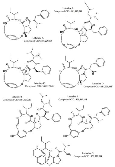 - Le Croueour, G.; Thepenier, P.; Richard, B.; Petermann, C.; Ghedira, K.; Zeches-Hanrot, M. Lotusine G: A new cyclopeptide alkaloid from Zizyphus lotus. Fitoterapia 2002, 73, 63–68. [Google Scholar] [CrossRef]