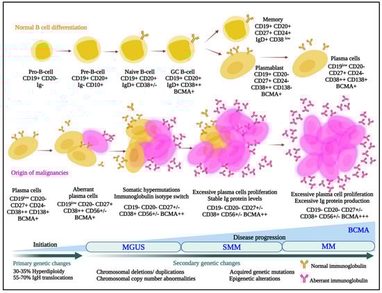 Normal (upper panel) and aberrant (lower panel) B-cell differentiation processes are outlined, and cells are annotated with some of the lineage-specific surface markers that may be targets for antibody–drug conjugates. MGUS, monoclonal gammopathy of undetermined significance; SMM, smoldering multiple myeloma; MM, multiple myeloma; BCMA, B-cell maturation antigen; IgH, immunoglobulin heavy locus.