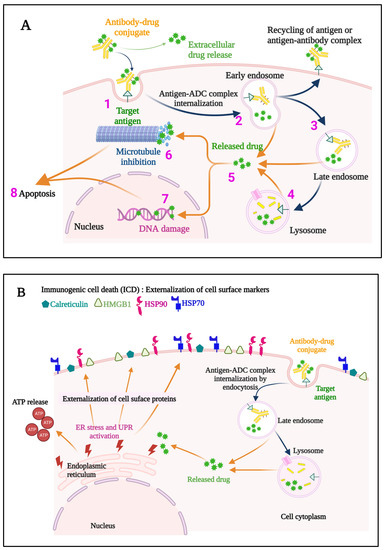 A representation of the events occurring both at the cell membrane and intracellularly that contribute to the direct cytotoxic mechanisms of action of an ADC (A) is provided. The ADC binds to the specific target antigen on the cell surface (1), the ADC-antigen complex is internalized (2), and endosome/lysosome mediated processing (3,4) results in the release of the cytotoxic payload into the cytosol (5). If an anti-microtubule agent is the payload, aberrant spindle formation may occur causing cell cycle arrest and apoptosis (6), while DNA intercalators cause DNA damage (7), ultimately leading to apoptosis of the cell (8). Some ADCs also induce immunogenic cell death (ICD) (B), which elicits a host immune anti-tumor response. Hallmarks of ICD include externalization of Calreticulin, and Heat shock protein 90 (HSP90) and HSP70, externalization and later release of High mobility group box 1 (HMGB1), and release of ATP. ER, endoplasmic reticulum; UPR, unfolded protein response; ADC, antibody–drug conjugate.