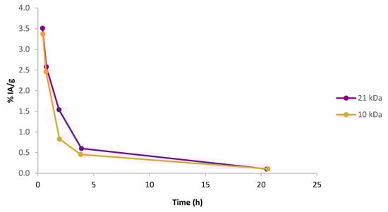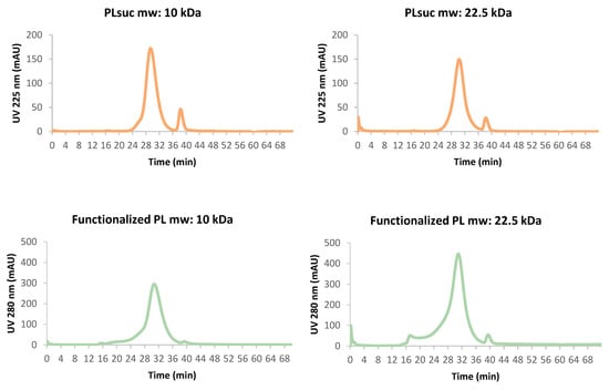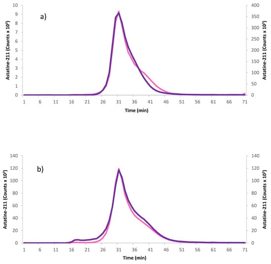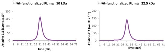 The structural integrity of the polymer was evaluated on an FPLC system ÄKTA purifier, Amersham Biosciences, GE Healthcare, (Sweden) with a Superdex 200 10/300 GL column Cytiva-GE Healthcare Bio-Sciences AB, Uppsala (Sweden) using a flow rate of 0.5 mL/min, comparing the UV chromatograms (225–280 nm) obtained from the succinylated and functionalized PL with the radioactive chromatogram obtained by fraction collection, 1/min, of the astatinated PL, measured using a NaI(Tl) detector.