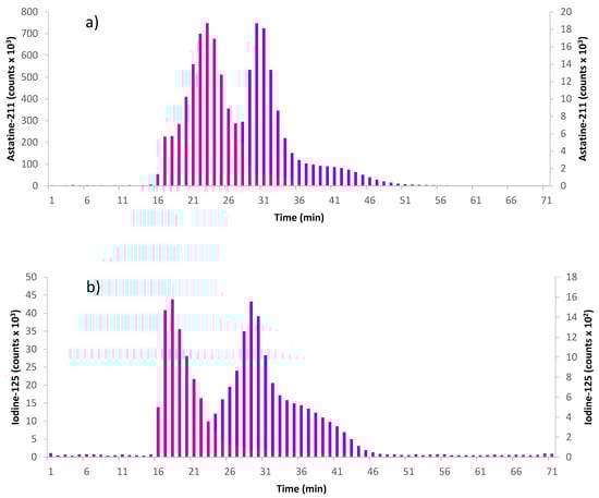 The best conditions for efficient and reproducible astatine labeling of conjugated PL of both polymer sizes were obtained by using NIS as an oxidizing agent (10 µL 20 µM for 5–25 MBq of 211At), which resulted in an RCY of 84.78% ± 0.03 for the small polymer and 85.38% ± 0.02 for the large polymer (based on >20 radiolabeling instances). For the iodination of both sizes of PL, the best conditions were obtained using CAT as an oxidizing agent (25 µL 8.79 mM for 1 MBq of 125I), in which the corresponding RCY values were 66.68% ± 0.14 for the small polymer and 91.16% ± 0.06 for the large polymer. The radiochemical purity (RCP) of both polymers was 97.7% ± 1.9 for the astatinated products and above 98% for the iodinated products.