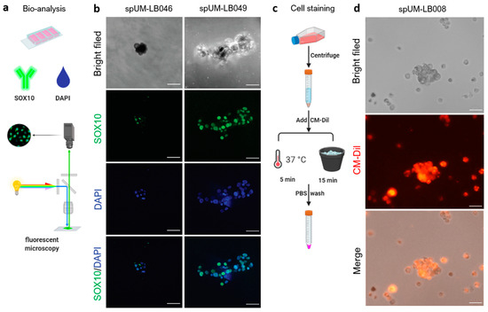 Analysis and transient chemical labelling of the patient-derived spheroids. (a) Workflow of immunostaining in the patient-derived spheroids. (b) Melanocyte marker SOX10 is expressed in spUM-LB046 and spUM-LB049. (c) Workflow of CellTracker staining of spheroids. (d) spUM-LB008 labeled using CM-Dil expressed red fluorescence and kept its spherical morphology for at least 5 days after staining. The images were taken with 20× magnification. The scale bar is 100 µm.