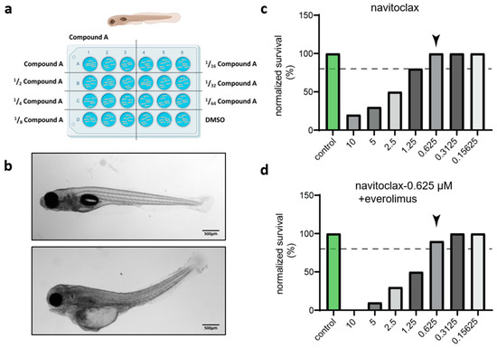 The maximum tolerated dose (MTD) of drug in the wild-type zebrafish. (a) Schematic diagram of the experimental set up for drug toxicity in wild-type zebrafish embryos: drug administration (3–7 dpf) and measurement of MTD (8 dpf). (b) Representative images of normal (top) and malformed (bottom) zebrafish larvae at 8 dpf. (c) The dotted line denotes the 80% survival rate used as a cut-off for the establishment of the MTD. The survival of zebrafish treated with navitoclax top exceeded 80% at concentration below 0.625 µM. The black arrow indicates the MTD of navitoclax (0.625 µM). (d) The black arrow indicates the MTD of navitoclax (0.625 µM) + everolimus (0.625 µM) when treated through bath submersion administration.