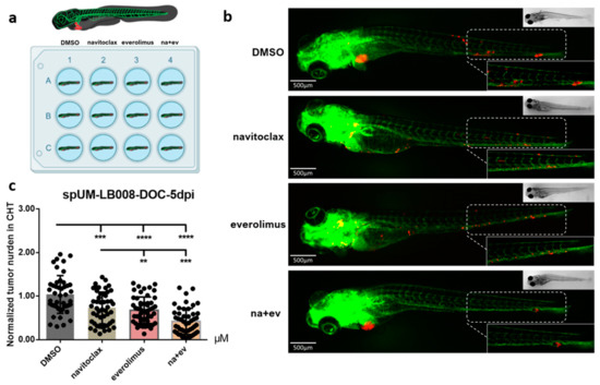 Navitoclax and everolimus and the combination of both chemotherapeutic agents reduced spUM-LB008 tumor burden in zf-PDX model. (a) The experimental layout of drug treatment in the UM zf-PDX model. (b) Representative phenotypes of zebrafish in the DMSO-control and drug treatment groups at 6 dpi (n = 3, p < 0.01). P values were indicated as follows: ** p < 0.01, *** p < 0.001, **** p < 0.0001. (c) Effect of navitoclax, everolimus, and their combination treatment on tumor burden, compared to the control group. The combination of navitoclax and everolimus reduced the tumor burden significantly compared to everolimus and navitoclax alone. The fluorescence intensity in CHT (white rectangle) of each individual zebrafish was measured as the metastasized tumor burden. The scale bar is 500 µm.