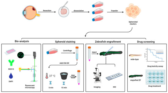 This technical study demonstrated the zf-PDX model as a robust and reliable platform for UM research and the screening of potential anti-UM drugs (Figure 6). Here, we have provided a step-by-step methodological description of this pipeline. First, we confirmed that the generation of short-lived spheroid cultures derived from primary UM tissues is feasible, as previously published by our group [71]. The SOX10 immunostaining validated that the spheroids maintained their composition of melanocytes over time. After disaggregation and transient staining, the spheroid suspension was injected into the circulatory system of zebrafish, and we demonstrated that we could trace the formation of metastatic foci in the tail of the engrafted larvae. The expression of Melan-A in larvae proved that the engrafted UM cells could survive, metastasize, and still possessed melanocytic characteristics in zebrafish. The applicability of this zf-PDX model for anti-UM drug screening was demonstrated in the proof-of concept study, using the BCL-2/BCL-xl inhibitor, navito-clax, and the mTORC1 inhibitor, everolimus, which were effective in murine-PDX models [38]. The combination of navitoclax and everolimus significantly reduced the tumor burden in the zebrafish, validating that our zf-PDX model is relevant and a versatile tool for drug screening.