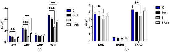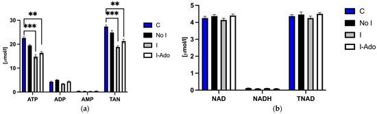 2.2. ATP (Adenosine Triphosphate), ADP (Adenosine Diphosphate), AMP (Adenosine Monophosphate), NAD (Nicotinamide Adenine Dinucleotide), Oxidized and Reduced Form of NAD (NADH), Total Adenine Nucleotide Pool (TAN), and Total NAD Pool (TNAD) in the Heart