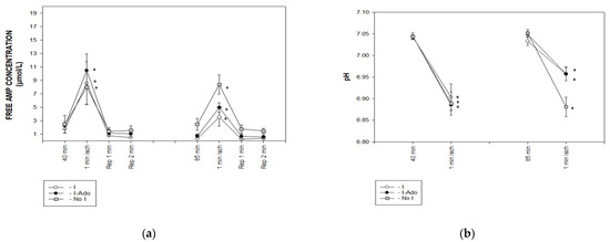 The concentrations of ATP, phosphocreatine, and inorganic phosphate, and the pH value obtained from the 31P NMR spectra, were used to calculate the free AMP concentration. During 1 min ischemia at 40 min, the free AMP concentration (Figure 5a) increased to 8–11 μM. This increase was reduced to the same extent (4 and 5 μM, respectively) in Groups I and I-Ado during 1 min ischemia at 85 min, while it was maintained at 9 μM in Group No I.