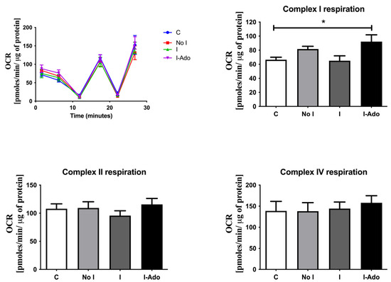 Figure 6 shows the oxygen consumption rate in the mitochondria of the rat heart subjected to repeated 1 min and 10 min ischemic intervals, as specified above. The oxygen consumption rate in complex I of the isolated mitochondria was increased in the I-Ado Group in comparison with the initial concentration in the No I and I Groups.