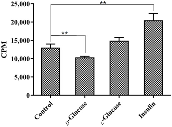As we know, [18F]FDG and [99mTc]Tc-EC-DG, which have entered clinical studies, have been proven to enter cells via GLUTs [16,45,46,47]. For the purpose of exploring whether the uptake mechanism of the [99mTc]Tc-CNMCHDG complex involves GULTs, D-glucose, L-glucose and insulin were added to cells to observe changes in the cellular uptake of the complex, respectively. Figure 3 shows that the cellular uptake of [99mTc]Tc-CNMCHDG was significantly inhibited by D-glucose addition (29%), but was not significantly changed by L-glucose. At the same time, it was found that the cellular uptake of the complex was obviously improved after the addition of insulin (57%). These preliminary results show that the way the complex enters the cell is similar to that of D-glucose.