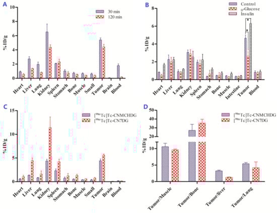 (A) Biodistribution of [99mTc]Tc-CNMCHDG in A549 tumor-bearing mice at 30 min and 120 min post-injection (n = 3). (B) Biodistribution of [99mTc]Tc-CNMCHDG in S180 tumor-bearing mice at 60 min post-injection with pre-treatment of saline (control), 2-deoxy-D-glucose (6 mg), or insulin (0.25 units) (* p < 0.05, n = 5). (C) Comparison of the biodistributions of [99mTc]Tc-CNMCHDG and [99mTc]Tc-CN7DG in A549 tumor-bearing mice at 120 min post-injection (n = 3). (D) Comparison of the tumor-to-background ratios of [99mTc]Tc-CNMCHDG and [99mTc]Tc-CN7DG in A549 tumor-bearing mice at 120 min post-injection (n = 3).