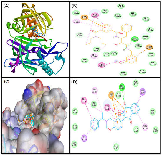 SwissADME (http://www.swissadme.ch) web-based tool was used and accessed on 15 February 2021, for predicting the properties of the 10 best docking hits such as molecular weight (MW), hydrogen bond donors (HBD), hydrogen bond acceptor (HBA), human gastrointestinal absorption (HIA), the permeability of blood-brain barrier (BBB), rotatable bond (RB), the fraction of sp3 (Fsp3) carbon atoms, cLogP value, and Lipinski’s rule of five violation [79].