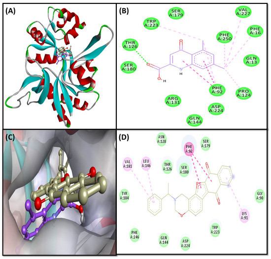 As previously reported, Desmond (Schrodinger-2020, LLC, New York, NY, USA) was employed to run a molecular dynamics simulation to evaluate the stability of target proteins with the best-shortlisted molecule after molecular docking and ADME study [8,66]. Briefly, the simulation was performed inside an orthorhombic box after placing the docked protein-ligand complex at the center at a 10 Å distance from the boundaries. TIP3P water molecules were used to solvate the box, and the appropriate Na+ or Cl counterions were added to neutralize it. To simulate physiological circumstances, 150 mM of sodium chloride was added. The system’s energy was minimized through the OPLS3e forcefield by performing 2000 iterations with a convergence criterion of 1 kcal/mol/Å. Finally, a 100 ns production run was conducted at 298 K temperature and 1 bar pressure, which were kept constant using a Nose–Hoover Chain thermostat and a Martyna–Tobias–Klein barostat [80,81]. The energies and structures were recorded every 10 ps, with the time-step fixed at 2 fs. The molecular dynamics simulation results have been investigated for the root mean square deviation (RMSD), root mean square fluctuation (RMSF), the radius of gyration (Rg), solvent accessible surface area (SASA), secondary structure elements (SSE), and molecular interactions established between ligand and protein during simulation. The findings of each experiment were run independently, in triplicate, and are shown as mean ± standard errors.