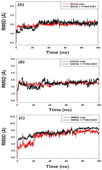 A protein-ligand complex’s RMSD is often calculated to assess the stability and dynamic properties of the complex. The RMSD is determined by deviating from the protein-ligand starting pose’s structure as a function of simulation duration [73]. In this experiment, we measured the RMSD of three target proteins (BACE, GSK3, and NMDA) in the presence of the chemical F1094-0201 throughout a simulation time of 100 ns (Figure 5). The RMSD of BACE increased during the first few seconds and remained consistent throughout the simulation. However, the RMSD of BACE in the presence of F1094-0201 fluctuated during 0–30 ns and then attained an equilibrium for 30–100 ns time. The average RMSD values of BACE in the absence and presence of F1094-0201 during 30–100 ns were 2.04 ± 0.36 Å and 2.18 ± 0.71 Å, respectively (Figure 5A). Similarly, the RMSD of GSK3β in the absence and presence of F1094-0201 fluctuated insignificantly during 0–35 ns and remained consistent within 2.0–3.4 Å throughout the simulation time. The average RMSD of GSK3β alone or the GSK3β-F1094-0201 complex during 35–100 ns were estimated to be 2.54 ± 0.61 Å and 2.78 ± 0.57 Å, respectively (Figure 5B). Likewise, the RMSD of NMDA in the absence and presence of F1094-0201 fluctuated during 0–20 ns and then equilibrated for the rest of the simulation time. The average RMSD of NMDA and the NMDA-F1094-0201 complex during 20–100 ns was 6.73 ± 0.76 Å and 7.85 ± 0.59 Å, respectively (Figure 5C).