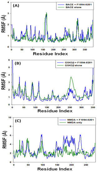 The monitoring of RMSF is often used to identify the local conformational changes in a protein’s side chains caused by the binding of a ligand [73]. Here, the RMSFs of BACE, GSK3β and NMDA were accessed in the presence or absence of the ligand F1094-0201 (Figure 6). Fluctuations at proteins’ N- and C-terminals are due to their higher flexibilities. The results indicate that the RMSF plots of target proteins in the presence of F1094-0201 were almost overlapping with the RMSF plot of target proteins alone. The average RMSF values of BACE, GSK3β, and NMDA in the presence of F1094-0201 were 0.88 ± 0.03 Å, 0.94 ± 0.06 Å, and 0.79 ± 0.05 Å, respectively, while the average RMSF values of BACE, GSK3β, and NMDA in the presence of F1094-0201 were 0.94 ± 0.06 Å, 1.14 ± 0.08 Å, and 2.82 ± 0.09 Å, respectively. These findings indicate that the protein-ligand combination is stable in nature and that the binding of the F1094-0201 compound did not significantly alter the overall structure of the target proteins.